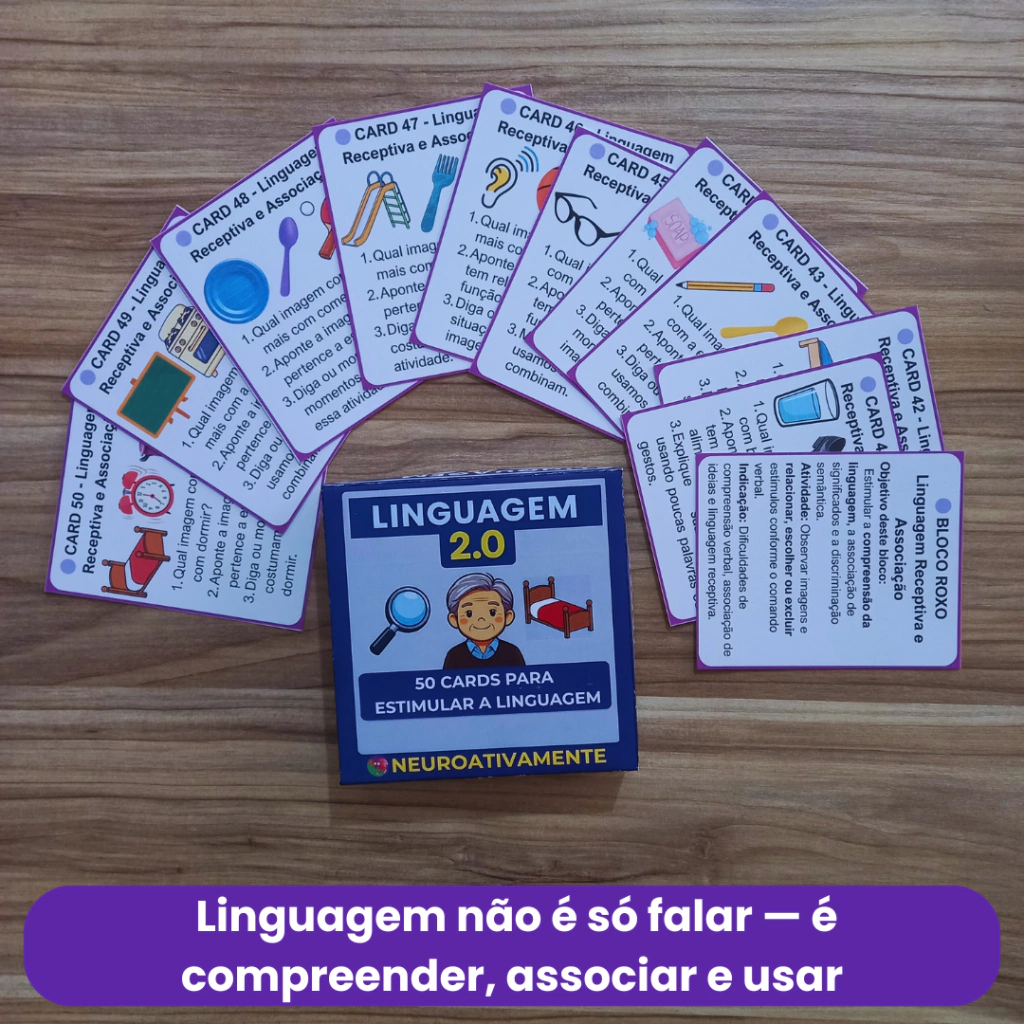 A Caixinha Linguagem 2.0 é um recurso de estimulação cognitiva desenvolvido para trabalhar a linguagem de forma funcional, organizada e progressiva, especialmente em adultos e idosos.
